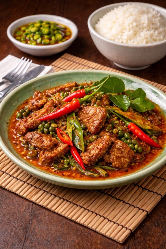 A bold and aromatic Thai stir-fry featuring tender slices of European wild boar flash-cooked with fragrant red curry paste, fresh chilies, kaffir lime leaves, and herbs. Rich, spicy, and deeply savory, this rustic dish delivers intense heat and wild flavors, perfectly balanced and best enjoyed with jasmine rice.