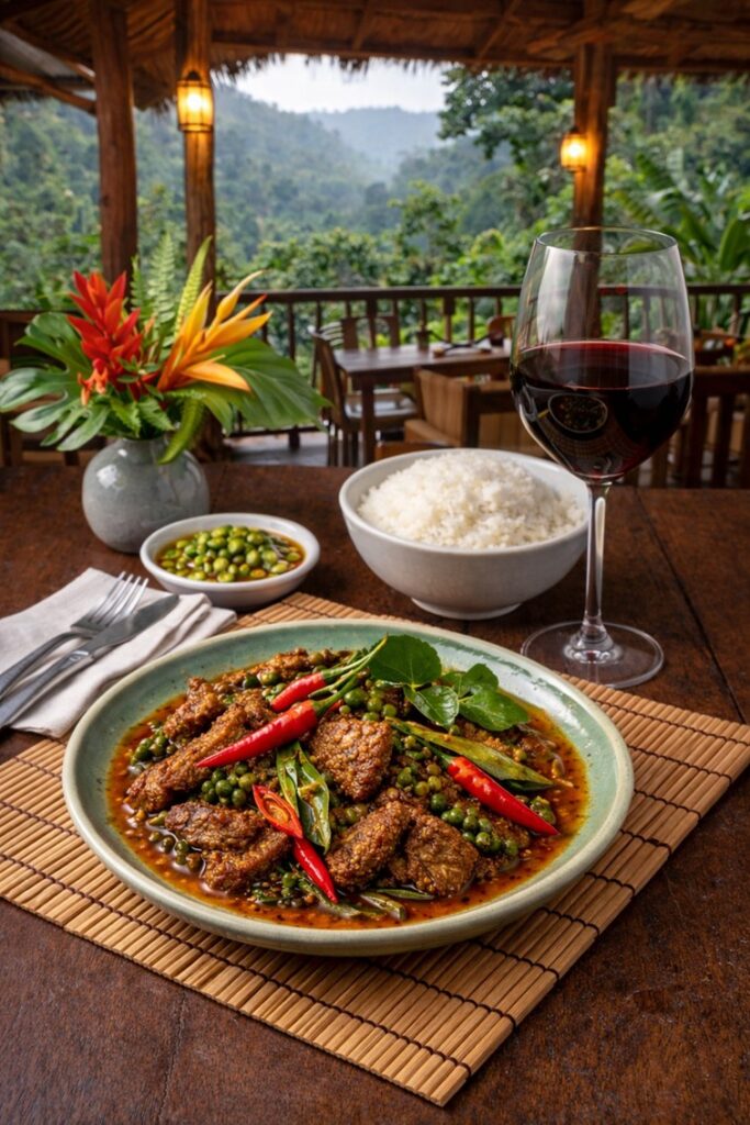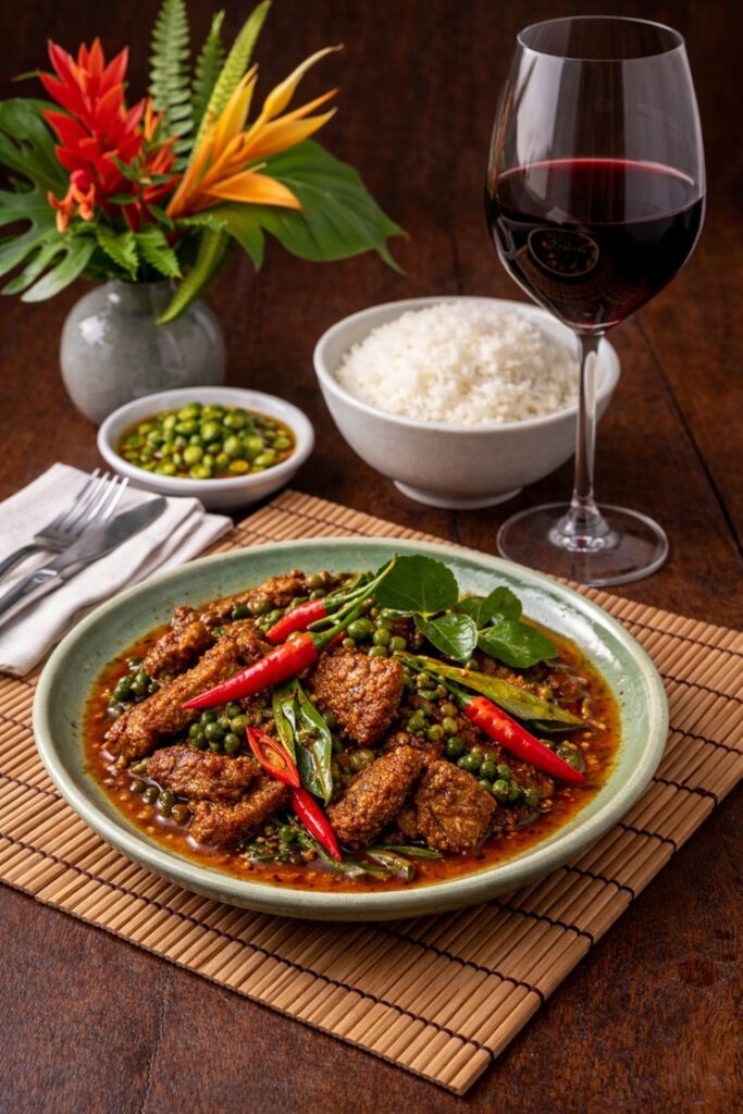 Pepper, olive, and savory meat notes in Northern Rhône Syrah resonate strongly with the bold flavors of Pad Ped. This matching shines, when spice is controlled, allowing the wine’s structure and herbal complexity to enhance the richness of the boar.