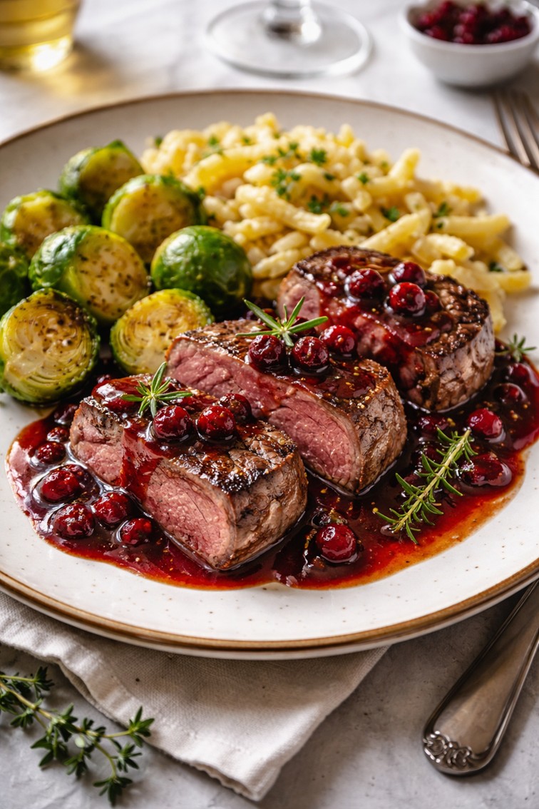 A classic German comfort dish. Lightly cured and gently smoked pork (Kasseler) is served juicy and tender, paired with tangy sauerkraut and smooth, buttery potato purée. The mild smokiness of the meat balances beautifully with the acidity of the kraut…