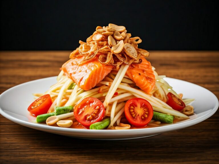 Northeastern Thai Papaya Salad with Grilled Salmon is a vibrant blend of tradition and modern flair. Crisp green papaya is tossed in a tangy dressing of tamarind, lime, and chili, enhanced with herbs, peanuts, and cherry tomatoes for lively texture.…